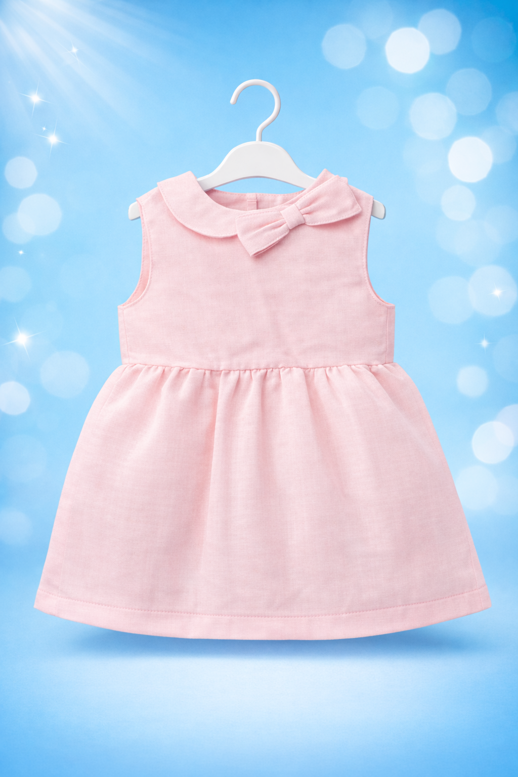 This light pink baby dress is a sweet and classic outfit, featuring a white Peter Pan collar and a matching bow accent at the neckline. It is sleeveless with an A-line silhouette and a gathered waist, made from a comfortable  cotton-blend fabric, perfect for a casual day out or a special occasion.