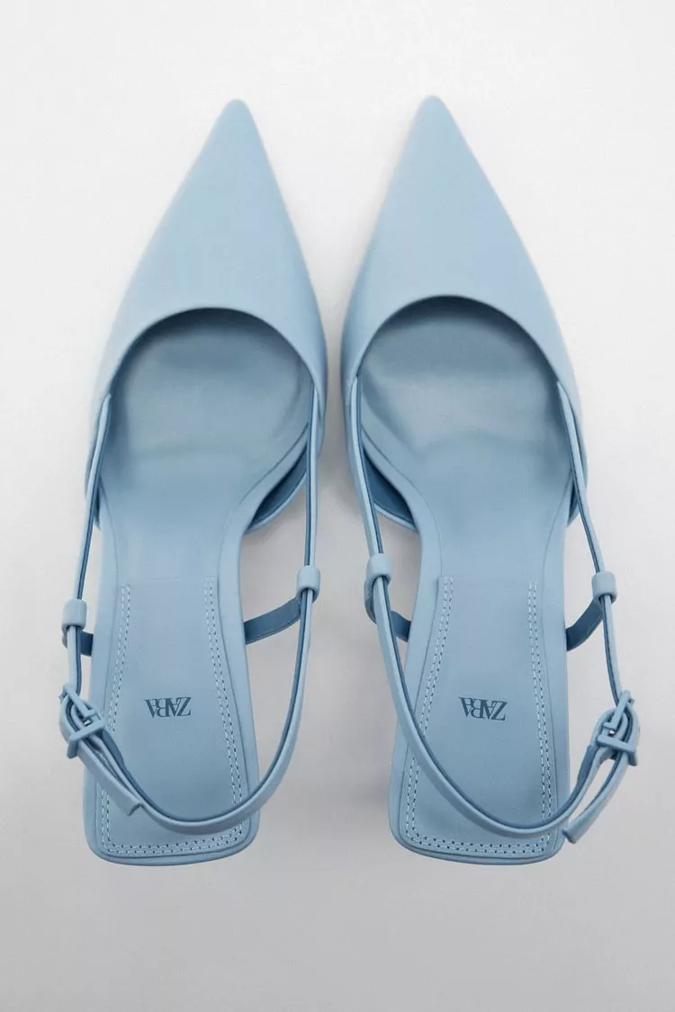 Step out in style with these elegant blue slingback heels from Zara. Designed to add a pop of color and sophistication to any outfit, they feature a pointed toe and a slim heel that elongates the legs beautifully. The adjustable slingback strap ensures a secure, comfortable fit, making them ideal for both formal occasions and chic everyday looks.
